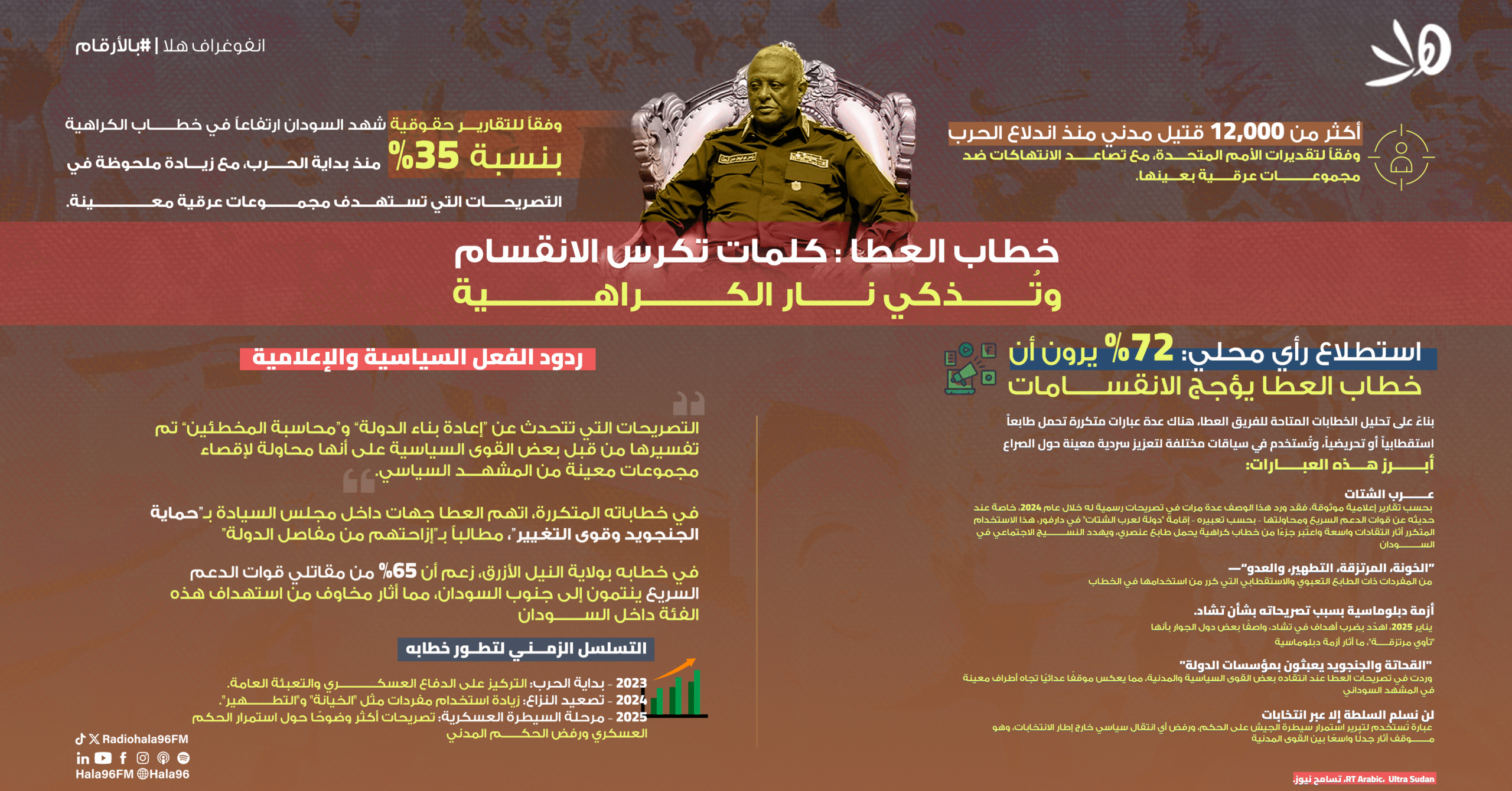 منذ 15 أبريل2023، لم تكن حرب السودان فقط في الميدان، بل أيضاً على المنابر والشاشات..خطابٌ يُحرّض، يُقسّم، ويغذي الصراع بدلاً من إطفائه لعب الشقيقان دقلو دوراً محورياً في هذا التصعيد مستخدمين لغة تُشعل الكراهية والعنصرية وتُعمّق من الأزمة.. كيف تتحوّل الكلمات إلى سلاح؟ وكيف يُعيد الإعلام رسم معارك الحرب 📊 التفاصيل الكاملة في انفوغراف هلا الكلمات أخطر من الرصاص المصادر hiwaratjeel.com Sudan Justice Hub سودان تربيون شبكة الصحفيين الدوليين مركز […]