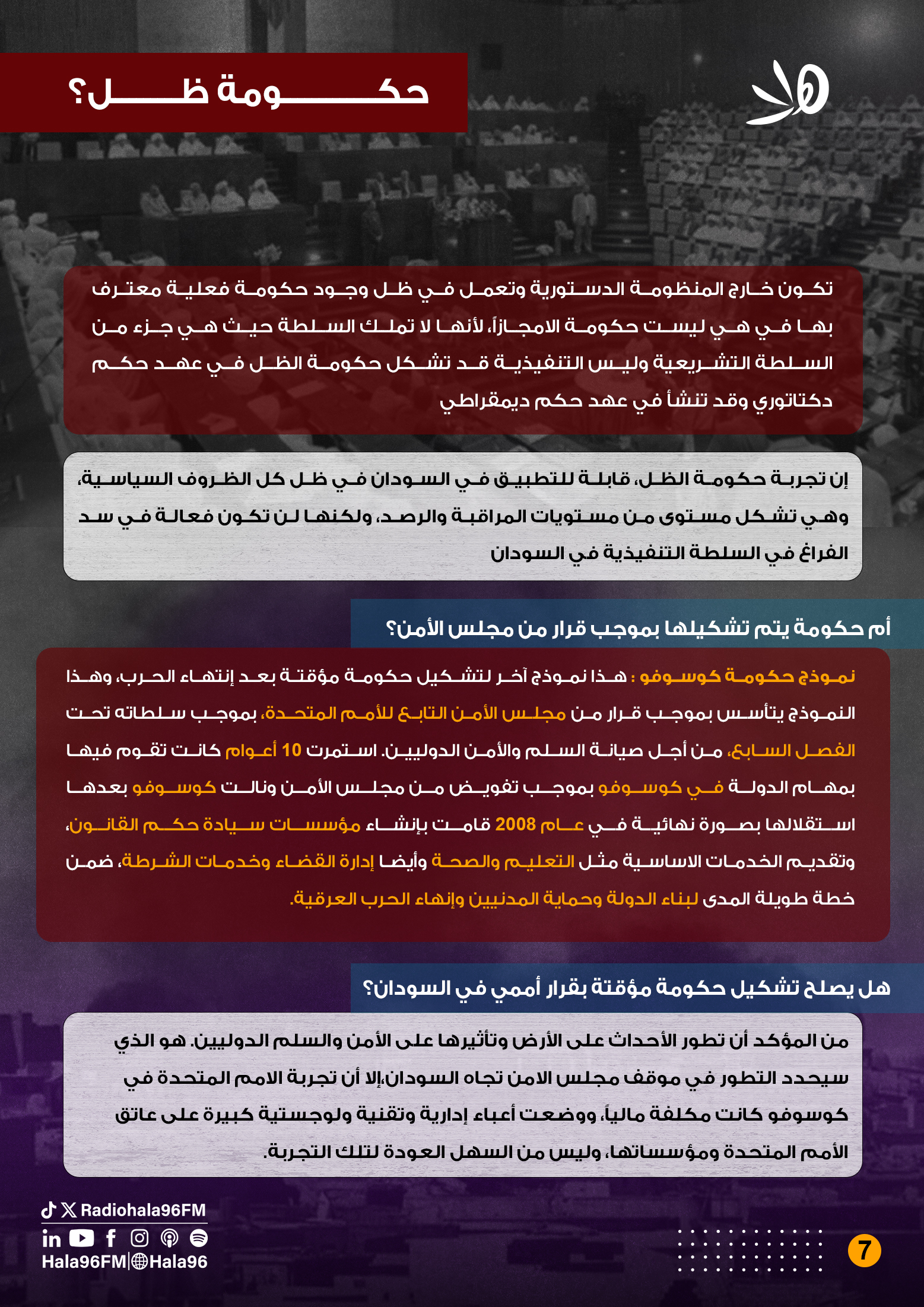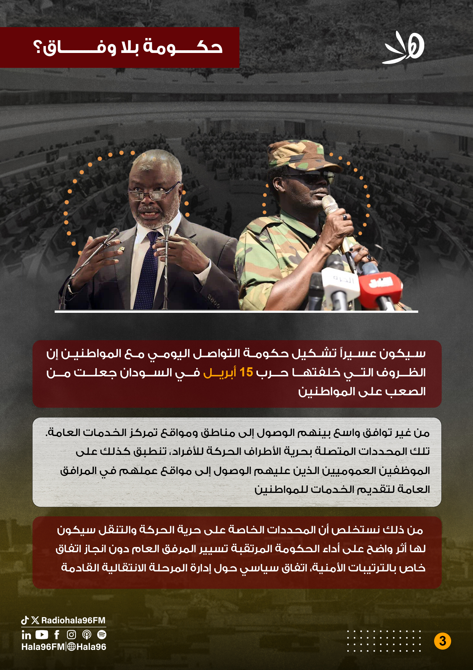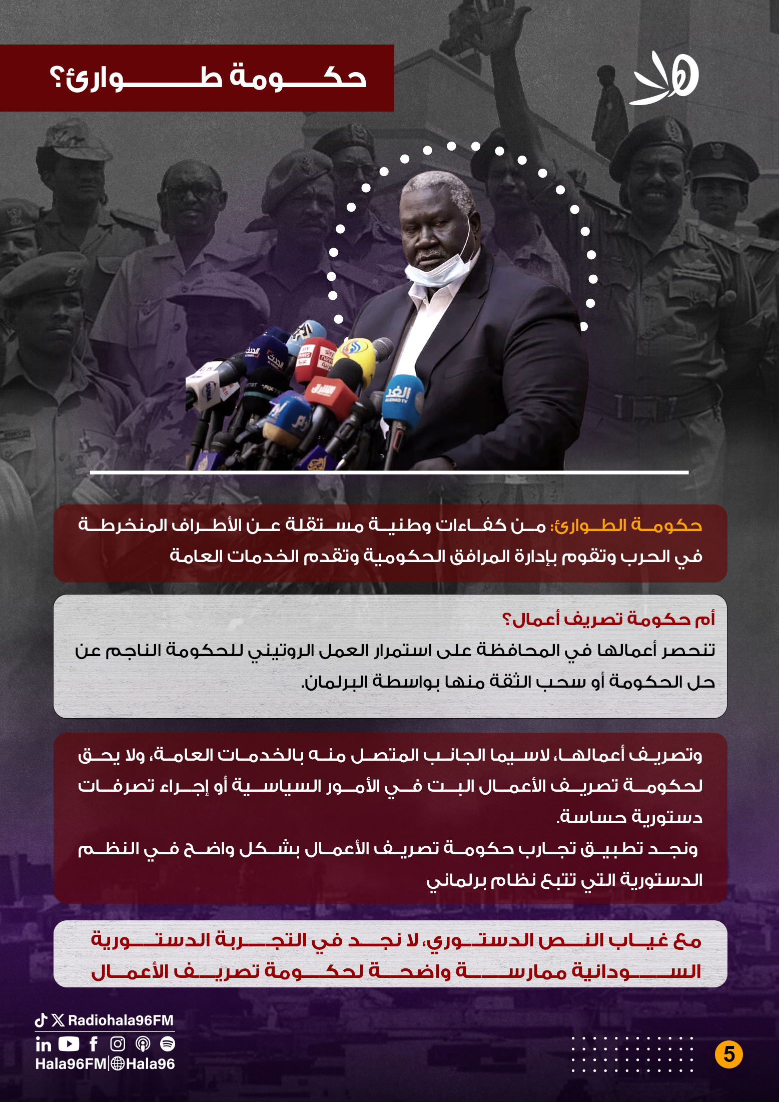 يرشدنا القياس وتفسير العرف الدستوري لحكومة الطوارئ، إلى أن تقوم سلطة الأمر الواقع ورئيس مجلس السيادة فيها، بتشكيل حكومة حرب تعينه في إدارة مؤسسات الدولة أثناء الحربوتعمل على تحشيد الإيرادات والموارد والمواطنين من أجل تحقيق أهداف الحرب وبالتالي، لا تحقق الغرض الذي نادت فيه المؤسسات المجتمعية في مبادراتها بتشكيل حكومة طوارئ..